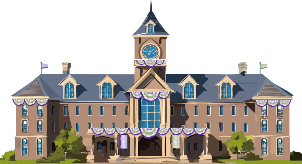 A grand building in Flamingo Springs where the mayor and city council meet. The lilac-colored Northern Colony flag flies at one end of the building and the sage-colored Flamingo Springs flag at the opposite end. The building is crowned by a clock tower with a bell inside that rings every 15 minutes (although fairies initially requested it ring every minute).